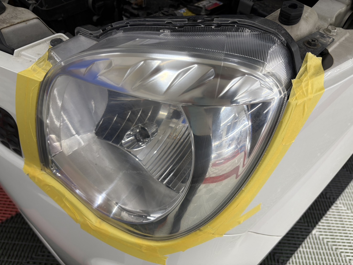 社用車として使用している日産モコに、ヘッドライトの黄ばみ除去とヘッドライトプロテクション(スモーク)を施工しました。