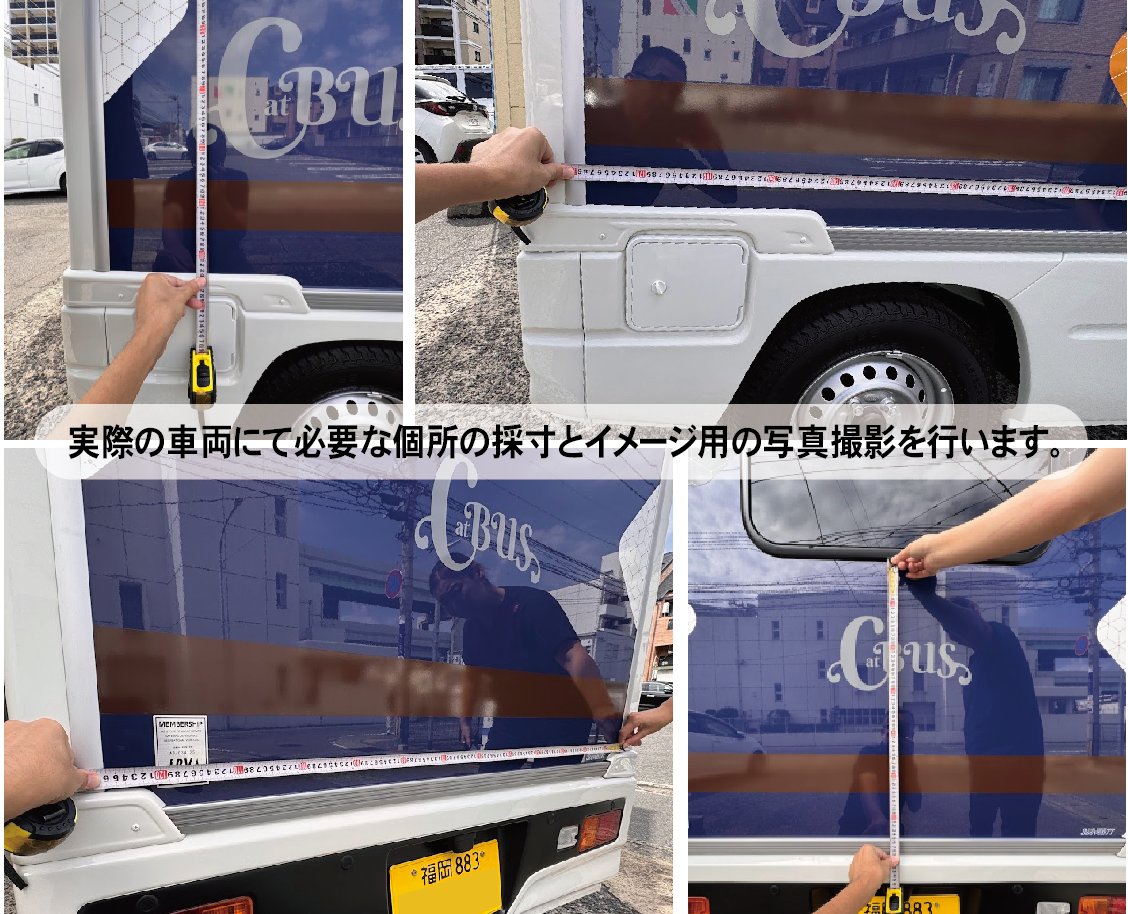 1、事前に現車確認をして必要な個所の採寸と前後左右の撮影。
